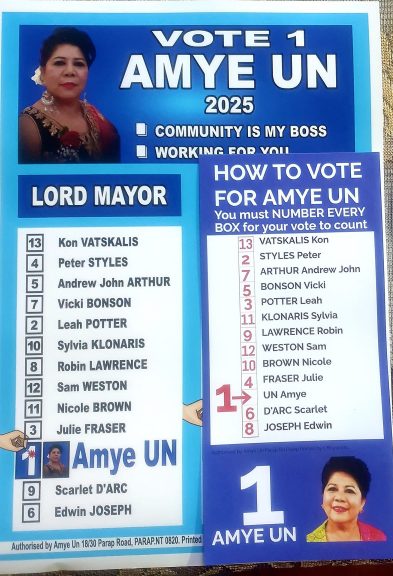 Fake how-to-vote cards distributed to polling centres purportedly for Darwin mayoral candidate Amye Un and another candidate that had their preferences altered has led to an NT Electoral Commission investigation, with the Territory’s anti-corruption body also briefed on the situation, as current mayoral frontrunner Peter Styles and candidate Leah Potter face allegations of breaching the Electoral Act.