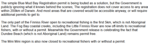While it is not made clear on the website exactly what the status of the rest of the river is, an AFANT statement says fishing was also banned on the Little Finniss River, and this is backed up by multiple industry sources who have also said fishing is banned on the river. They said there are also no permits for the river because the local traditional owners do not allow it.