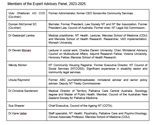 On July 22, 2023 – well after the federal parliament’s passage of the Restoring Territory Rights Act – Chief Minister Natasha Fyles announced the appointment an ‘expert advisory panel’ under the Inquiries Act to lead “a community consultation process for the development of a framework for Voluntary Assisted Dying (VAD) that will be suited to our needs for accessible and safe care”.